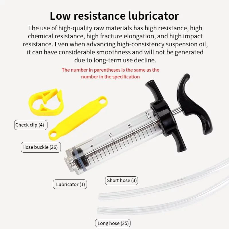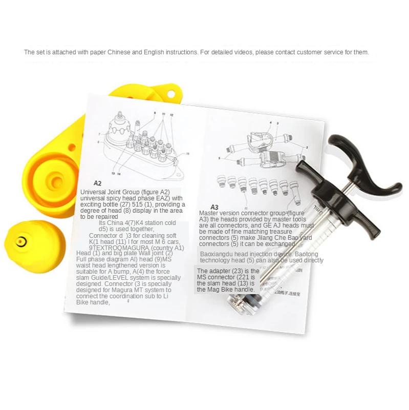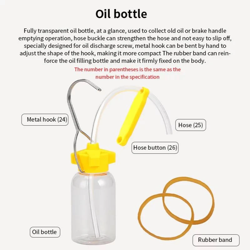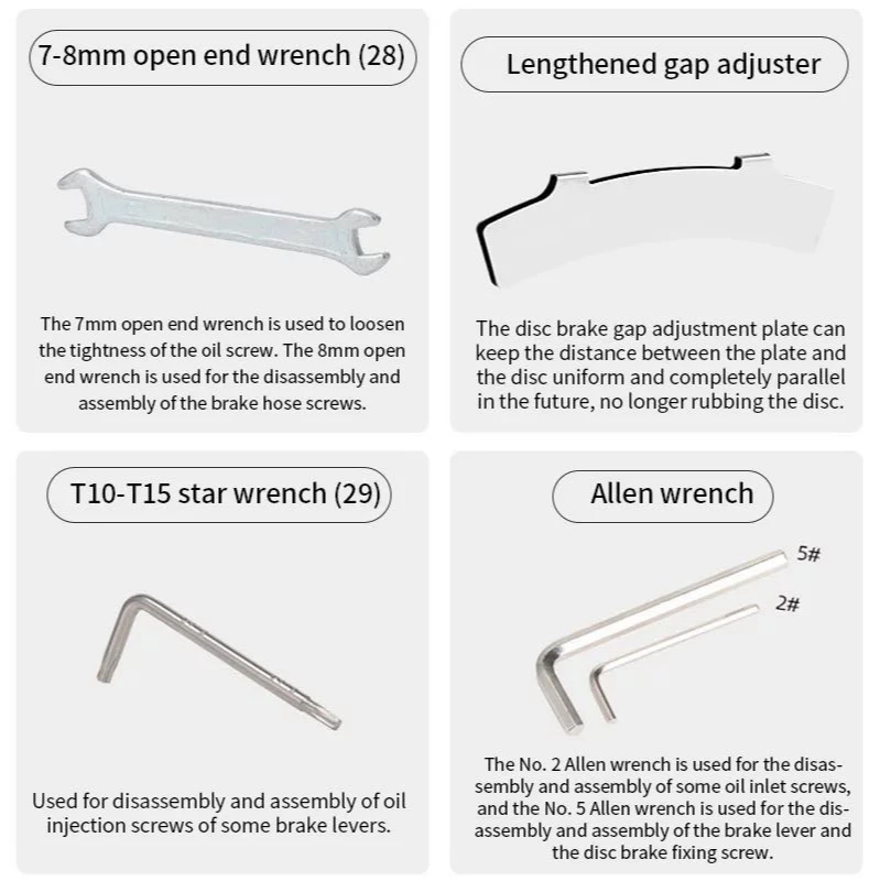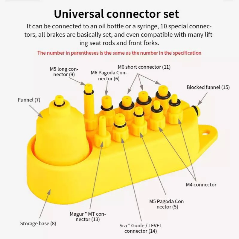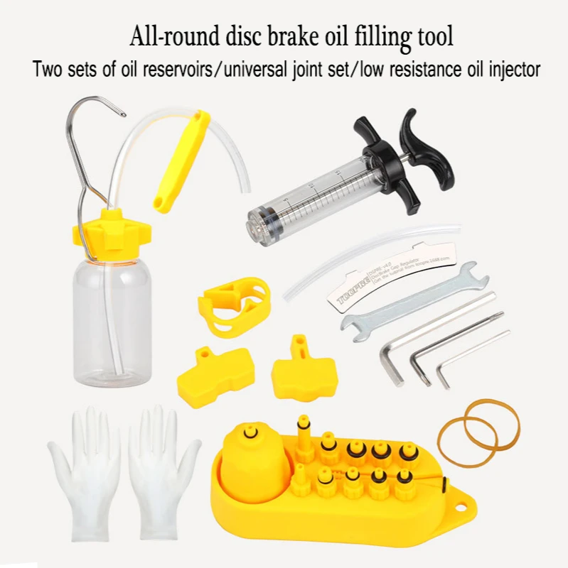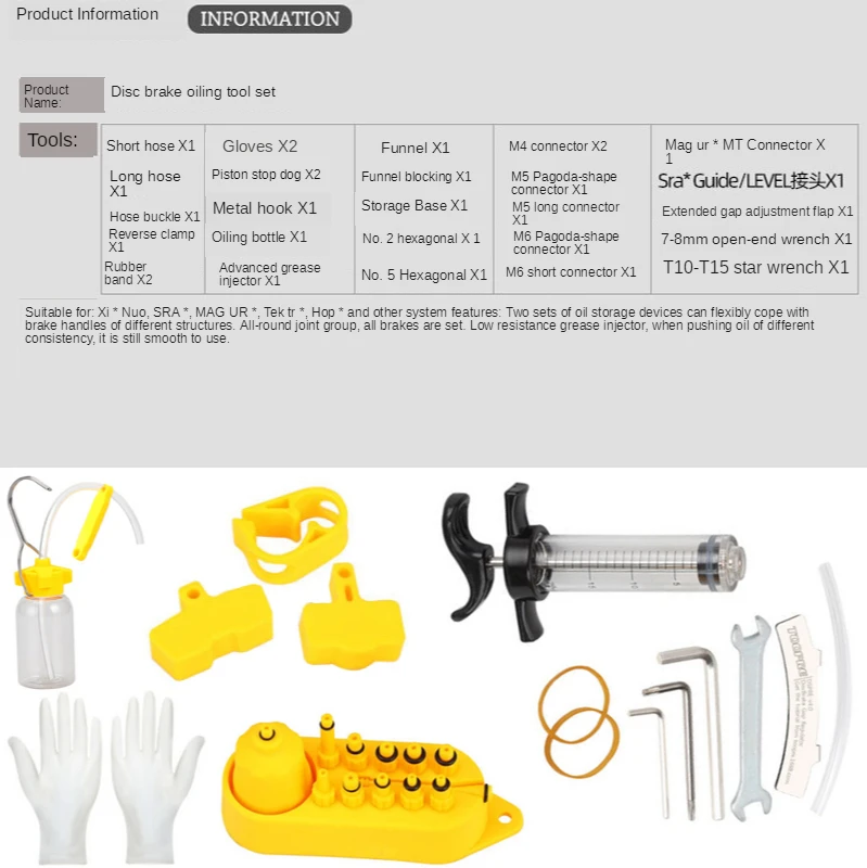 В комплект входят все инструменты, которые добавляют масло на дисковые тормоза, профессиональные и практичные.