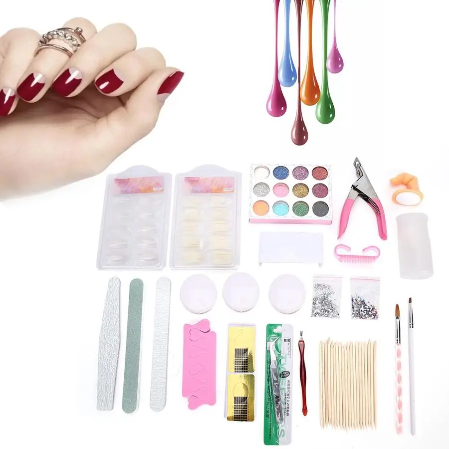 1 x щетка для ногтей 1 х средство для удаления омертвевшей кожи 2 х сумки Стразы 1 x ручка для дизайна ногтей 1 акриловая ручка 1 пара разделителей пальцев 1 x Пакет форм для ногтей 1 пинцет 1 х оранжевая деревянная палочка 2 x пилка для ногтей Полировальная лента-1 шт. 1 x накладные ногти 1 ножницы 1 x чашка 1 бутылка 2 x коробка наконечника для ногтей 1 x Блестящий Порошок 3 х акриловый порошок