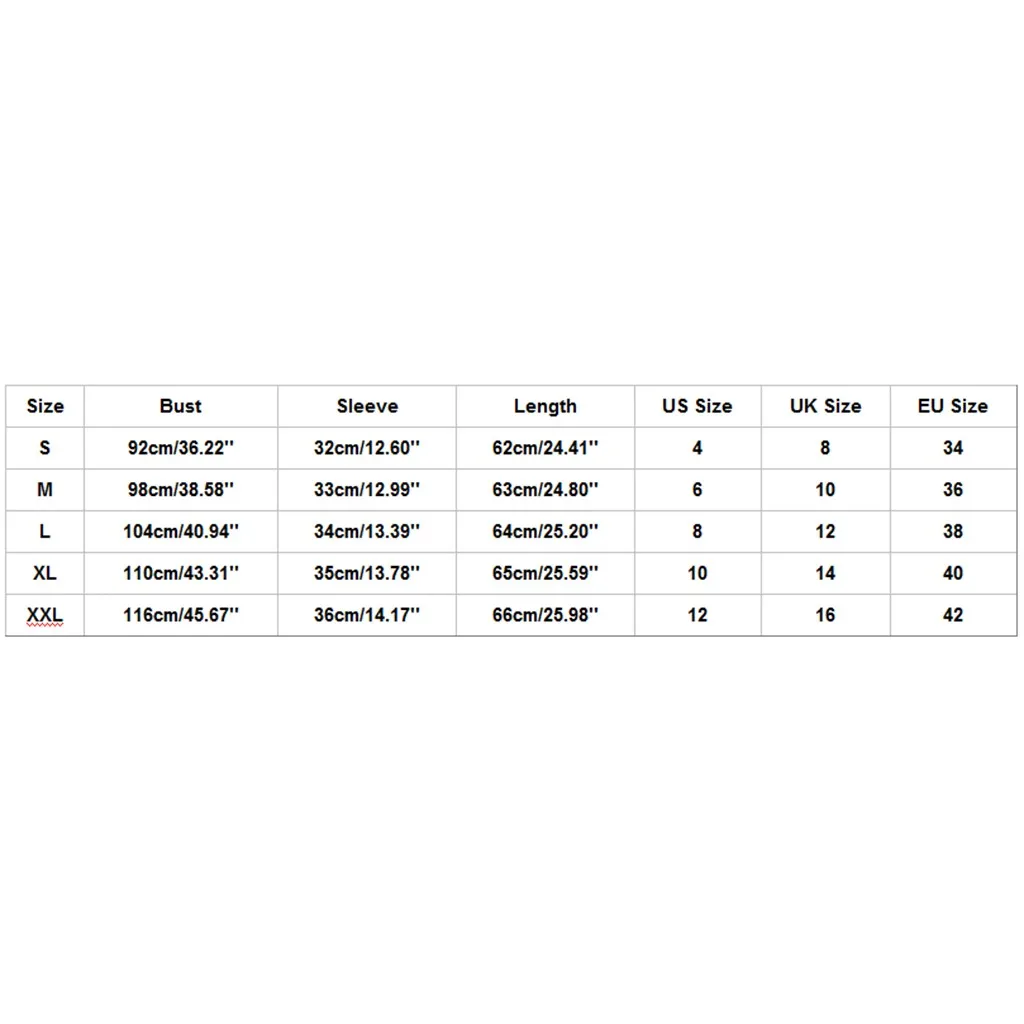 | Size | Bust | Sleeve | Length | US Size | UK Size | EU Size |