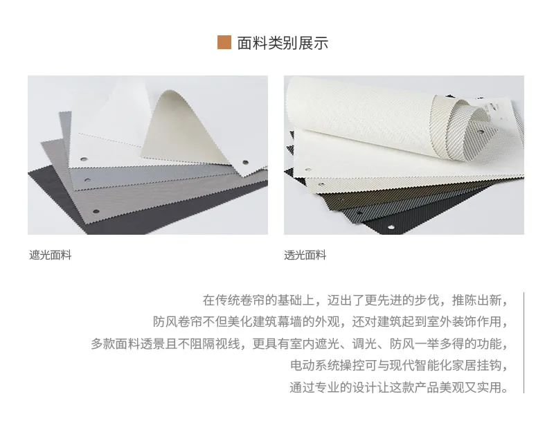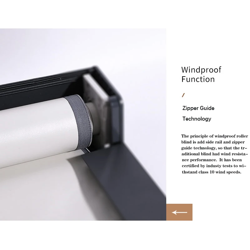 Отличная структура, добавляющая боковую рельсу и технологию направляющей молнии, хорошая устойчивость к ветру; Использование резинового бегуна и амортизирующей резиновой прокладки для уменьшения шума; Стандартный 40 трубный мотор, более точное позиционирование хода, сильное скрытие; Высококачественная ткань от солнца, защита от ультрафиолета, ветра, дождя, разрыва и огнестойкости, прочная