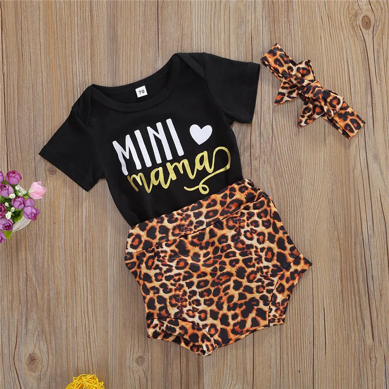 Emmaaby/комплект одежды из 3 предметов для маленьких девочек, Черный боди с короткими рукавами + леопардовые шорты + повязка на голову, Одежда для новорожденных 0-18 месяцев