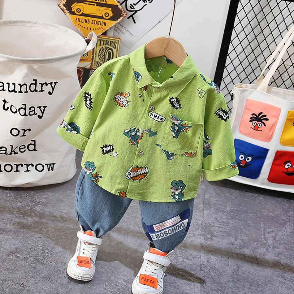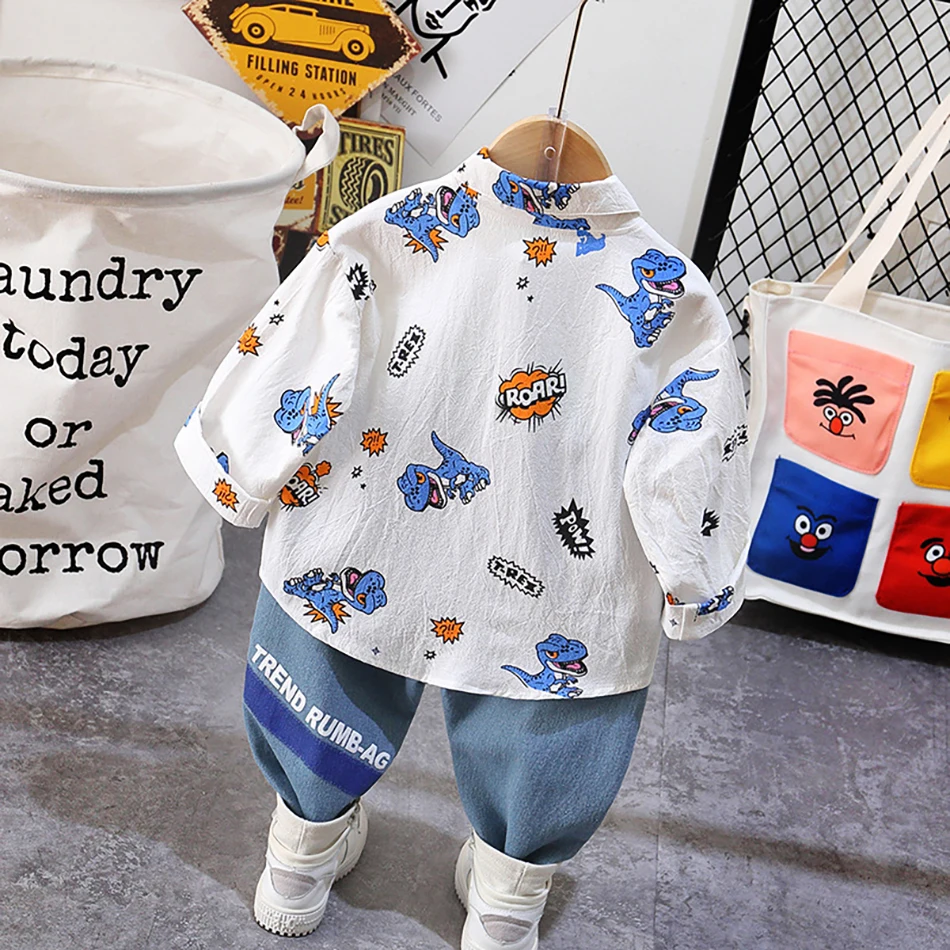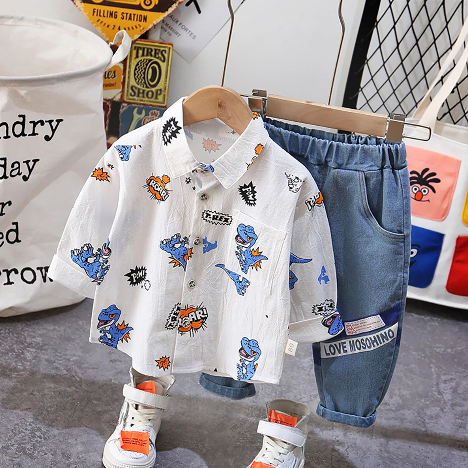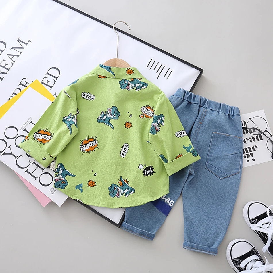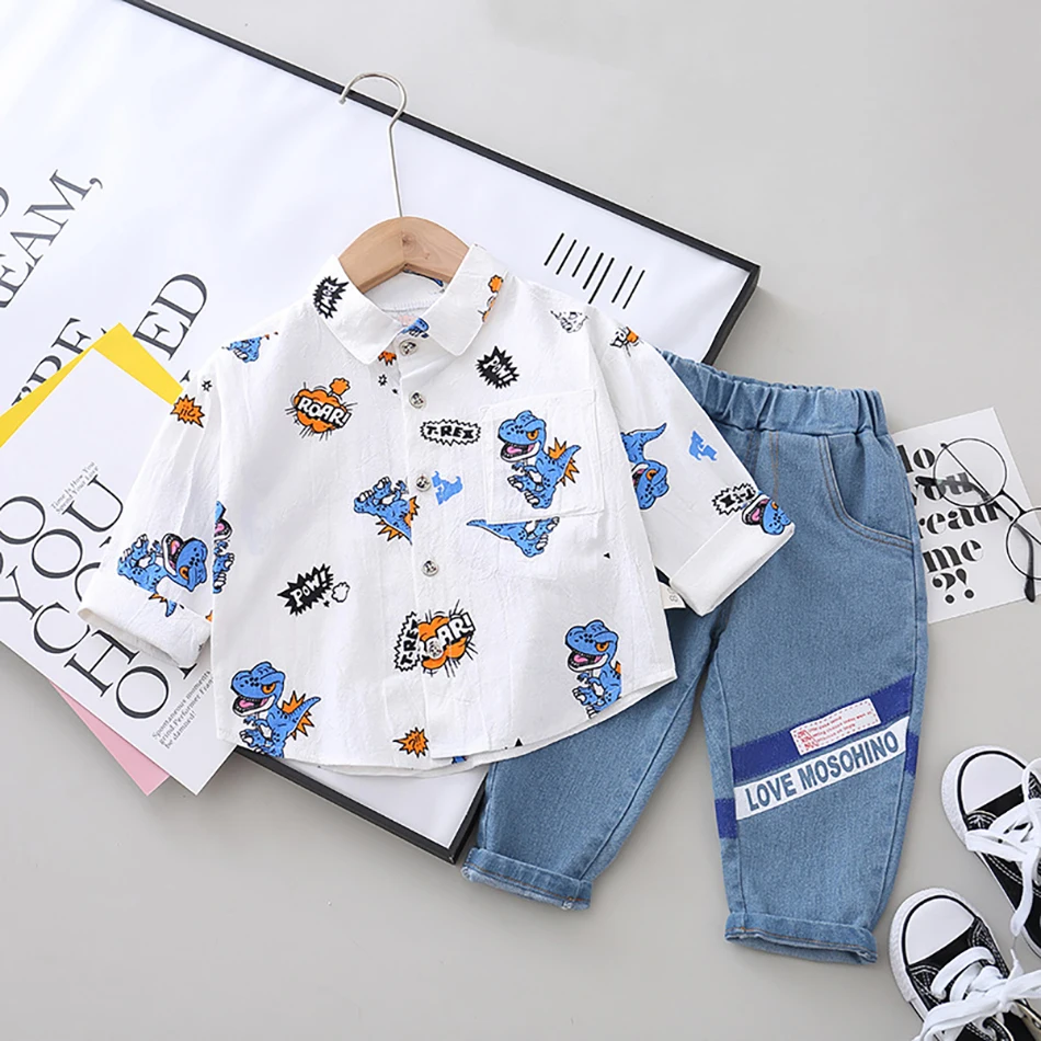 Новинка 2020 года; Модные топы с принтом динозавра для маленьких мальчиков + штаны; Джинсовый комбинезон; Комплект из двух предметов; Повседневный стиль; Цветные комплекты одежды; Сезон весна-осень