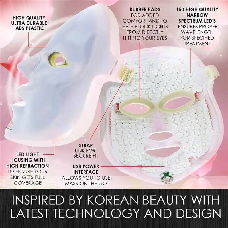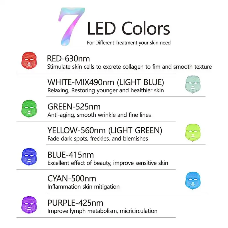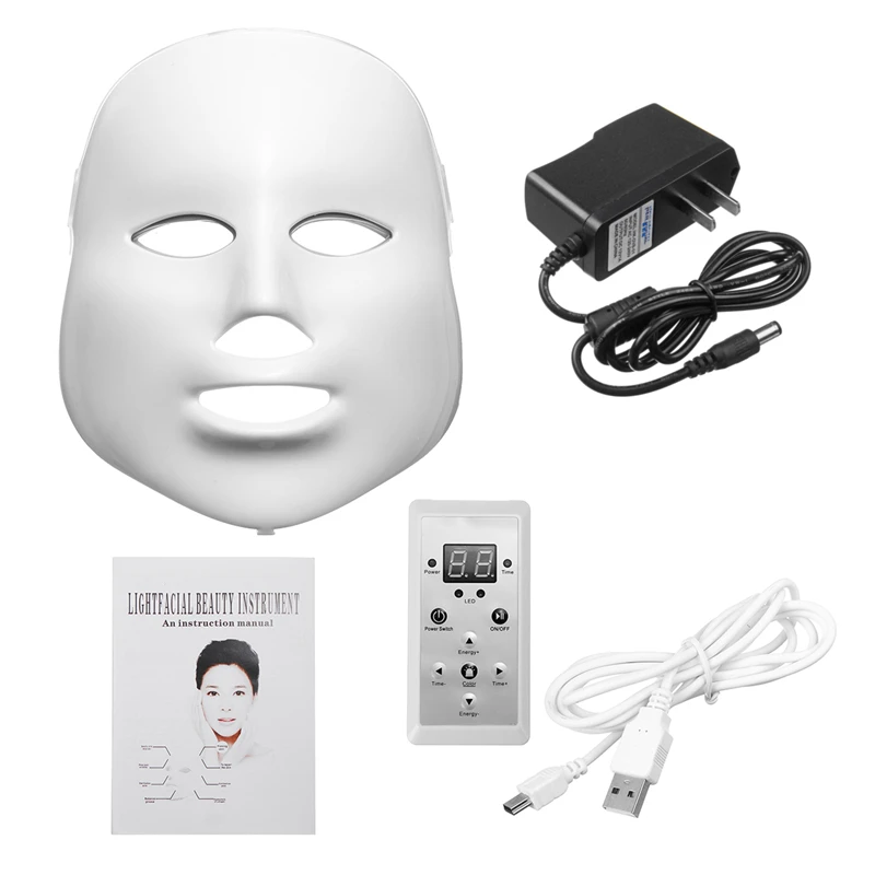 Main Function And Advantage: -Help activate collagen and promote the growth of skin collagen to make the skin more transparent and moisturized. -Tighten the pores, increase skin brightness to make skin smooth and supple. Accelerate the detoxification. -Effectively accelerate skin metabolism and promote the excretion of skin toxins. - Improve skin permeability. Increase oxygen to keep skin moisture. Repair the skin. -Promote blood circulation, dilute edema and red blood cells. -Improve sleep quality. Improve blood circulation and relaxation. Enhance immune system. - Relieves pain and stiffness and also promotes the skin health. -Decrease scars -It comes with Face LED therapy, 7 Colors LED Light Photon Therapy -Easy to operate with full touch screen -Remote control, more convenient -Frequency adjustable on the screen to re-adjust the handle -Qualified chip make precise wavelength for the better treatment effect -Real cold light, long lifetime -Electric stimulation treatment and replace taking medicine. Kill the bacteria that makes and spot, prevent from relapse Specifications: Type: LED Photon Face Neck Mask Target Area: Face Skin Type: All Skin Types Power: UK/US/EU plug adapter Voltage: 110V-220V Material: ABS Colors of Lights: 7 Colors LED QTY: 192 leds Concerns: Age Spots/Freckles, Early Signs of Aging, Blemishes, Dark Circles Application: Personal Home, Beauty Center LED mask make the skin smooth and elastic recovery. Import nutrition anytime,anywhere to enjoy 20 minutes. 7-COLOR LIGHT SPECTROSCOPY -Red Light (Red-630nm) It will stimulate the growth of collagen. Collagen is an essential protein that used to Repair damaged Tissue and to repair the old tissues. It can remove fine line and shrink pores. -Blue Light (Blue-470nm) Bacteria in acne contains Porphyrins; because of the high affinity with wave length, the blue light is able To kill Porphyrins. In addition, the blue light has calm action which is very effective for hypersensitivity. -Green Light (Green-520nm) The green light can balance the color pigment, and reduce fine lines, improve ageing skin, speed up the healing Process of the wound, lightening the skin. -Yellow Light (Yellow-590nm) It has special 590nm wavelength, so it can improve the exchange of oxygen in the cells, to the skin cells to Replenish their energy, decomposing pigment, promoting lymphatic drainage, improving the wrinkles, rough skin and etc. -Purple Light (Red+ Blue) Purple Acne removal, It is red and blue dual-band light, it is a combination of two kinds of phototherapy effect, Especially in the treatment of acne and acne mark has special good effect and repair effect. -Cyanine Light (Cyanine) Penetrate the skin deep, speeds up the living tissue of Chen xin metabolism, decompose splash, improve the appearance Of fine lines and sagging skin. -Laser Light (White) It can penetrate the skin deeply, so to accelerate the tissue metabolism, decomposition color spots, improve the Appearance of fine lines and ageing skin. Packing including : 1 x LED Beauty Mask 1 x Power Adapter