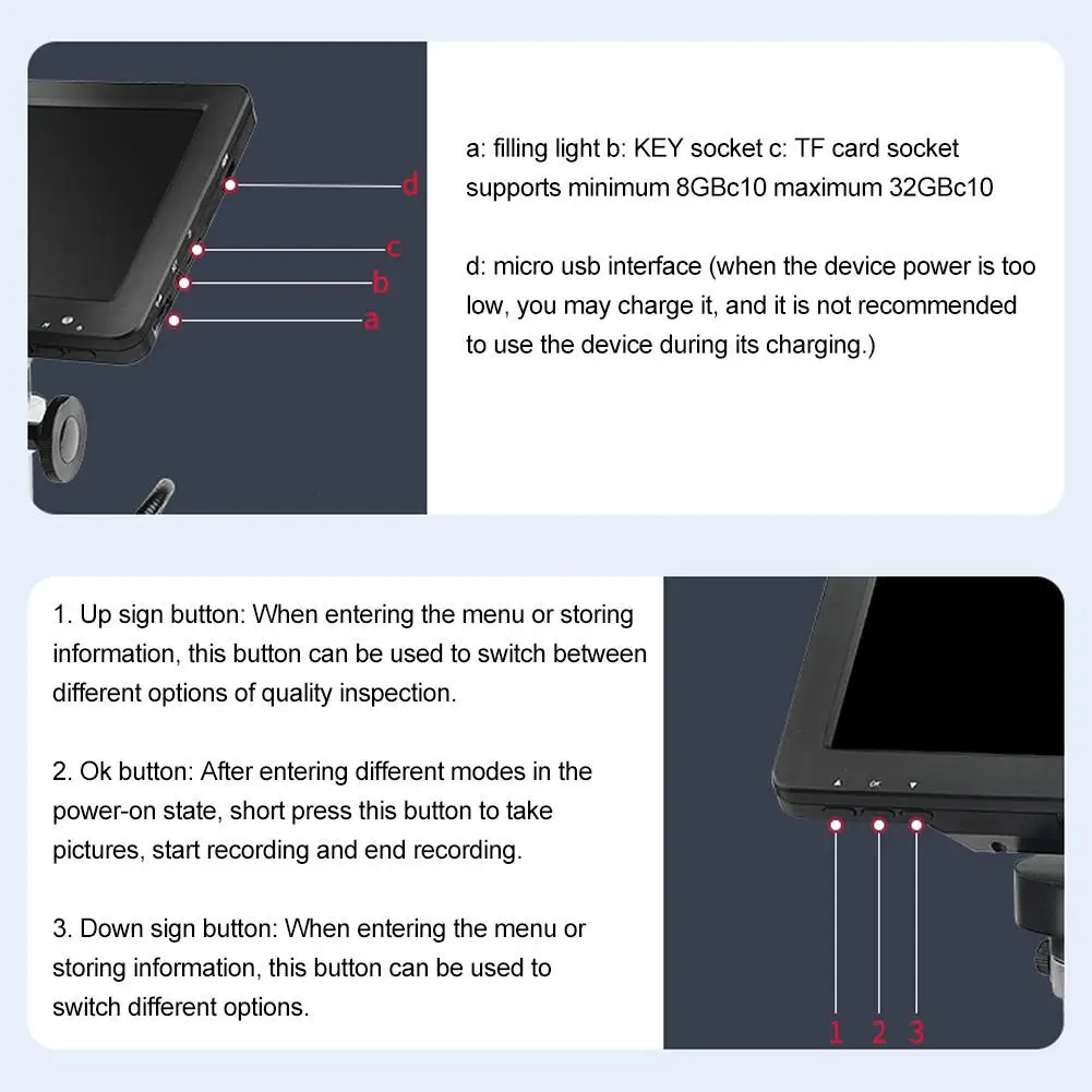 1. Широкое применение: микроскоп широко используется для компьютерного осмотра деталей, контроля сварки электронных компонентов, научных учебных инструментов, бетона, проверки кожи головы, идентификации ювелирных изделий и других аспектов.1 x Инструкция
