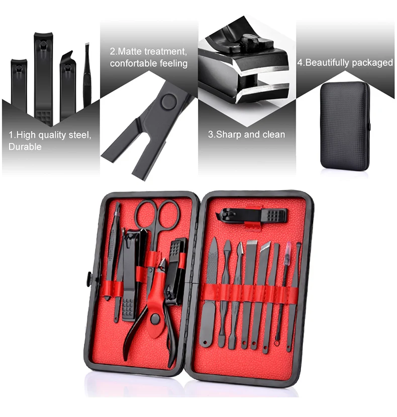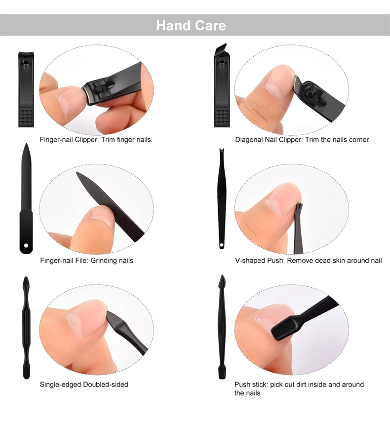 Особенности: Тип: Наборы инструментов для маникюра/педикюра Пол: унисекс Цвет: черный Количество: 15 шт./компл. Материал: нержавеющая сталь, из искусственной кожи Дизайн: нескользящий, черный Посылка включает в себя: 1 Набор инструментов для маникюра/педикюра Подробности: 2 * ножницы: отделка бровей 3 * кусачки для ногтей: отделка ногтей 1 * Кусачка для кутикулы: отделка кутикулы 1 * пилка для ногтей: делает ногти закругленными, гладкими 1 * Пинцет: Выщипывание Бровей и вросших волос 1 * толкатель омертвевшей кожи: отделка лица, ногтей, мозолей, омертвевшей кожи и т. Д. 1 * нож для очистки ногтей: очистка грязи в ногтях 1 * выбор ушей: Чистка ушей 1 * плоское средство для удаления мозолей: очистка кожи deak на ноге 1 * средство для удаления мозолей Olique: очищающее средство для кожи ног 1 * средство для удаления мозолей с зигзагом: очищающее средство для кожи ног 1 * игла для акне: Удаление угрей/акне