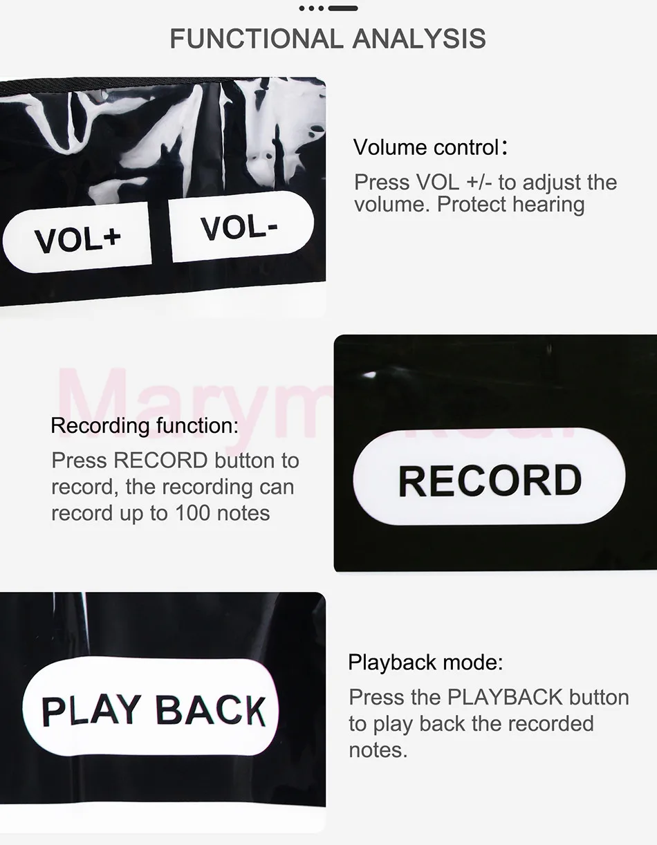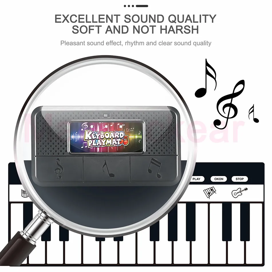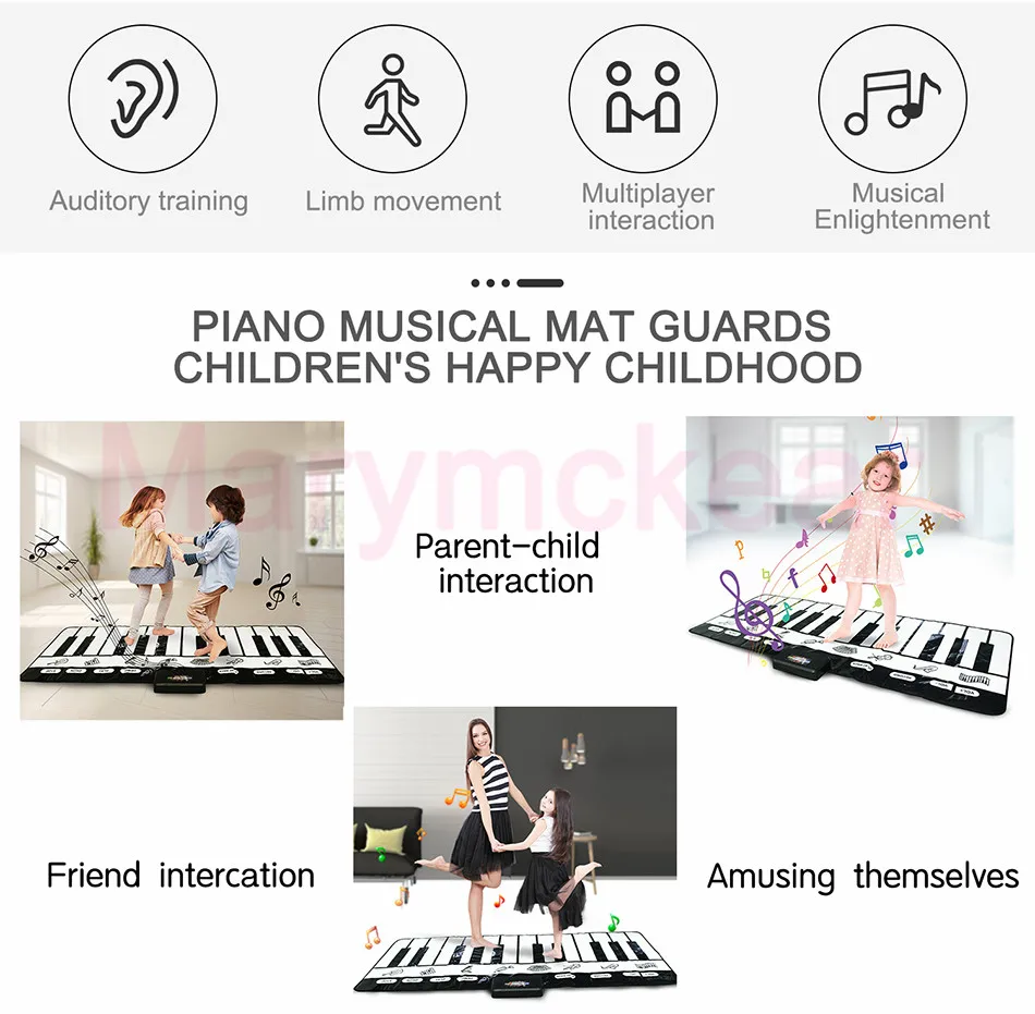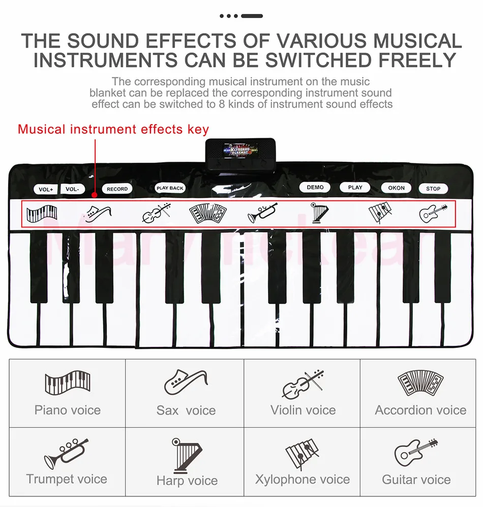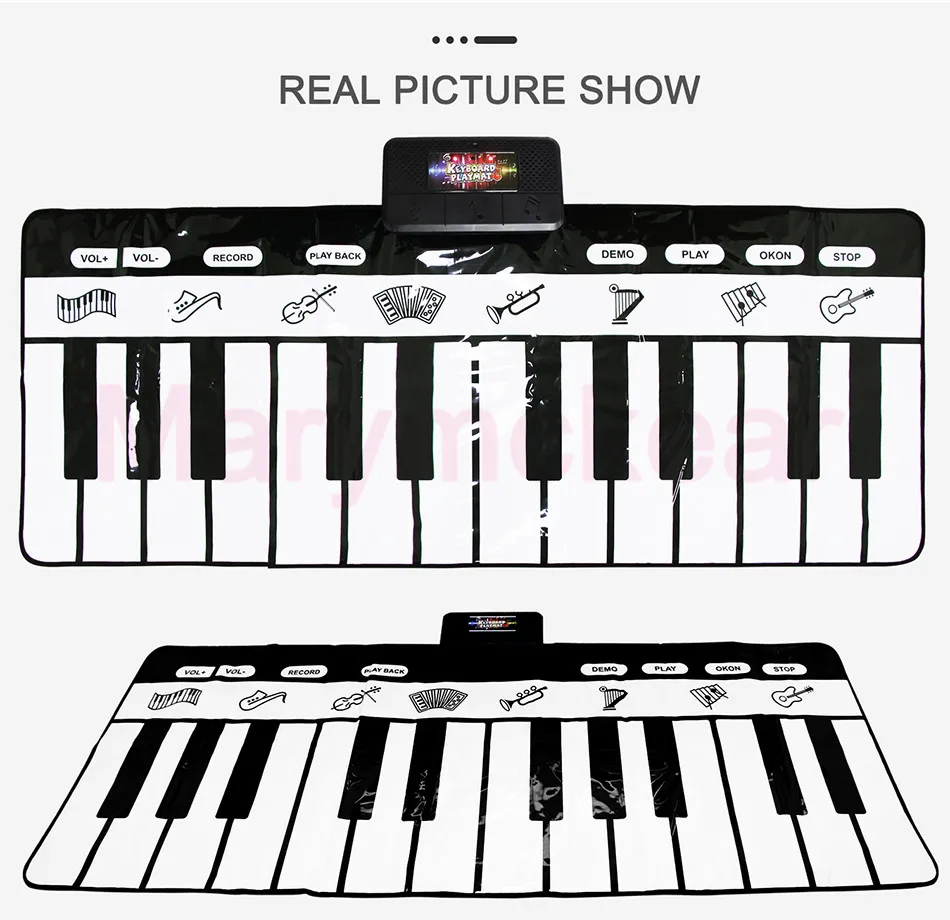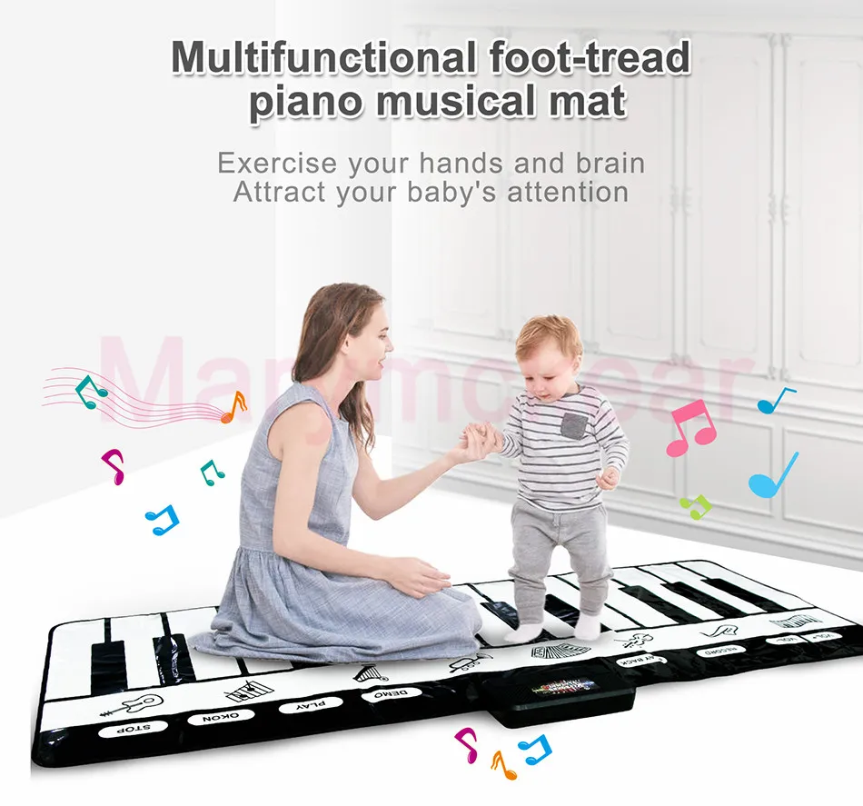1. Дети не только развивают свой музыкальный интеллект, развивают руки и мозги, тренируют слуховую систему, но и привлекают внимание ребенка и приносят чистое удовольствие через этот коврик. 2. Многофункциональная поддержка типа игры: Взаимодействие родителей и детей, взаимодействие друзей, забавное. 3. Толщина черно-белых клавиш и расстояние между ними в самый раз. Вы можете использовать как руки, так и ноги для физических упражнений. 4. Bulit-in 10 аккомпанементных песен, легко воспроизводить красивую музыку (Нажмите черный ключ для переключения музыки). 5. Есть режим записи и режим воспроизведения. Он может записывать все творения ребенка и воспроизводить их, чтобы ребенок мог наслаждаться их творением. 6. Каждая клавиша имеет соответствующую функцию, может легко переключаться. Если вы не нажмете какую-либо клавишу в течение 1 минуты, продукт превратится в спящий энергосберегающий режим, вы просто нажмите любую клавишу для перезапуска.