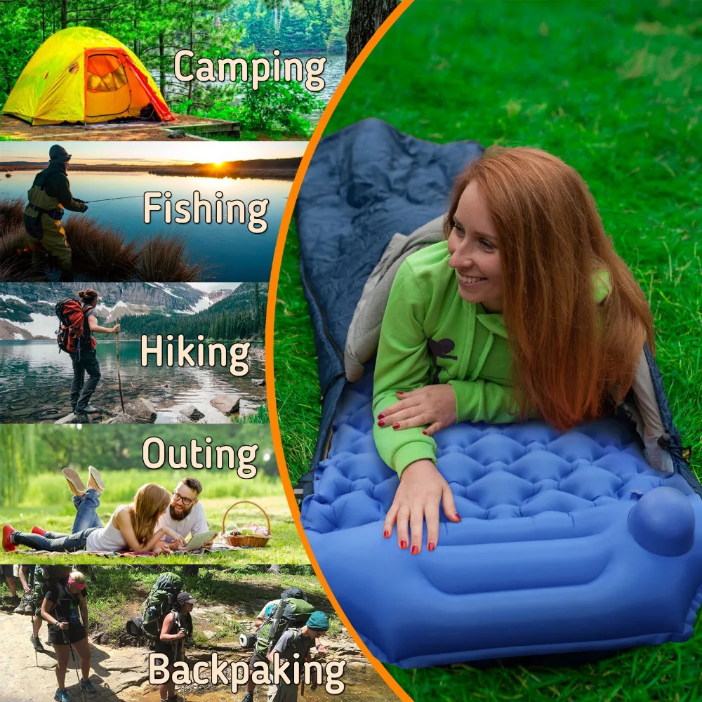 <Исопо Кемпинг pad имеет 6 см толщиной после надувания, сохраняя тепло и комфорт, изолируя холодность от земли <Поставляется с надувной подушкой, как сотовой коврик для земли, так и подушка придают Улучшенный Эргономичный дизайн, удобная мягкая конструкция адаптируется к форме вашего тела, обеспечивая оптимальный опыт сна. <С боковыми кнопками вы можете подключить два матраца к двойной кровати. Максимальная нагрузка составляет 300 кг