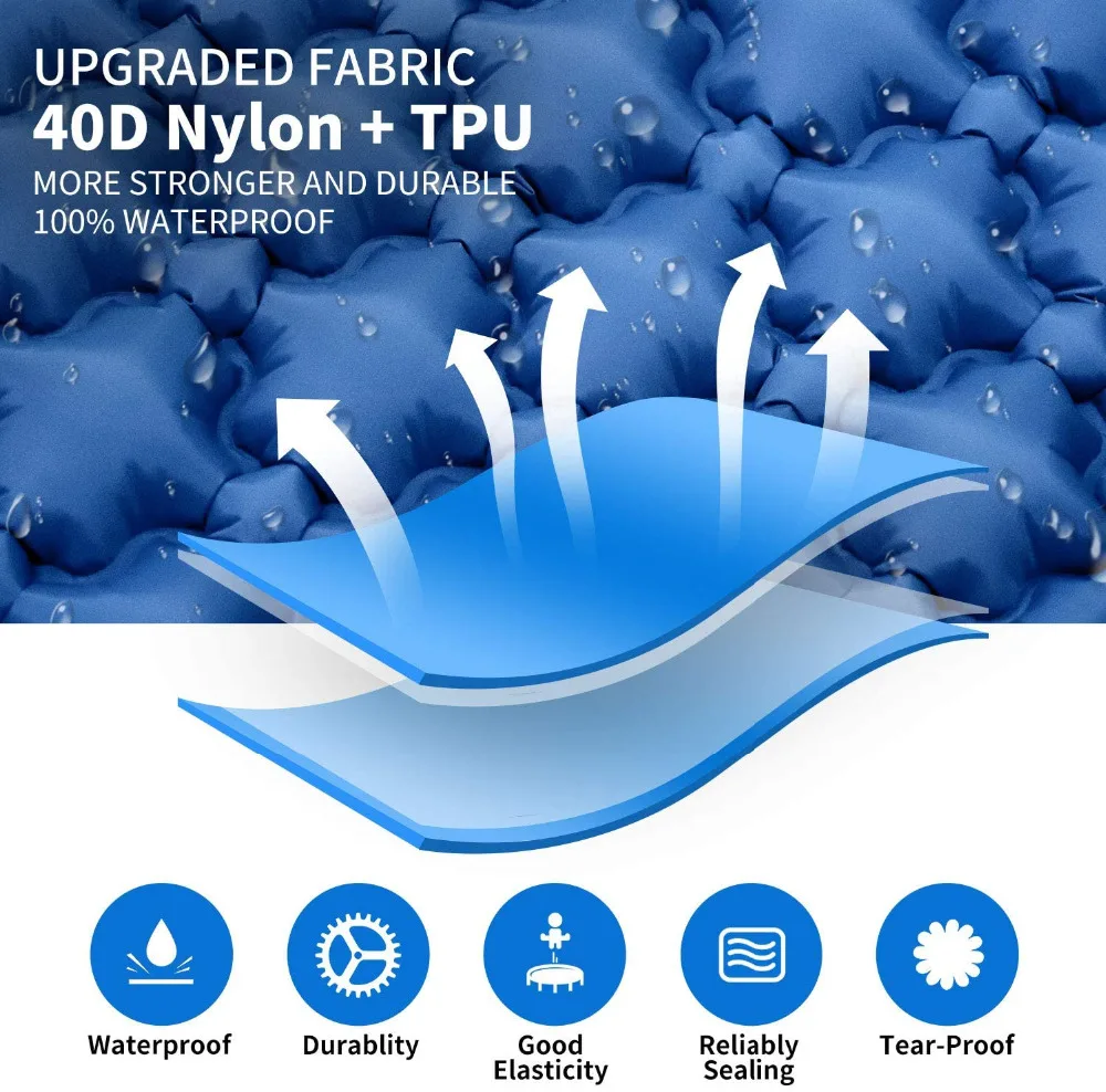【Сверхлегкий и прочный 】 <Он изготовлен из сверхпрочной водонепроницаемой и походной нейлоновой ткани ripstop (40D нейлоновая ткань и экструдированное ламинирование ТПУ). Этот спальный коврик устойчив к разрыву, проколу и влагонепроницаемый. Не беспокойтесь о острых камнях или ветках.