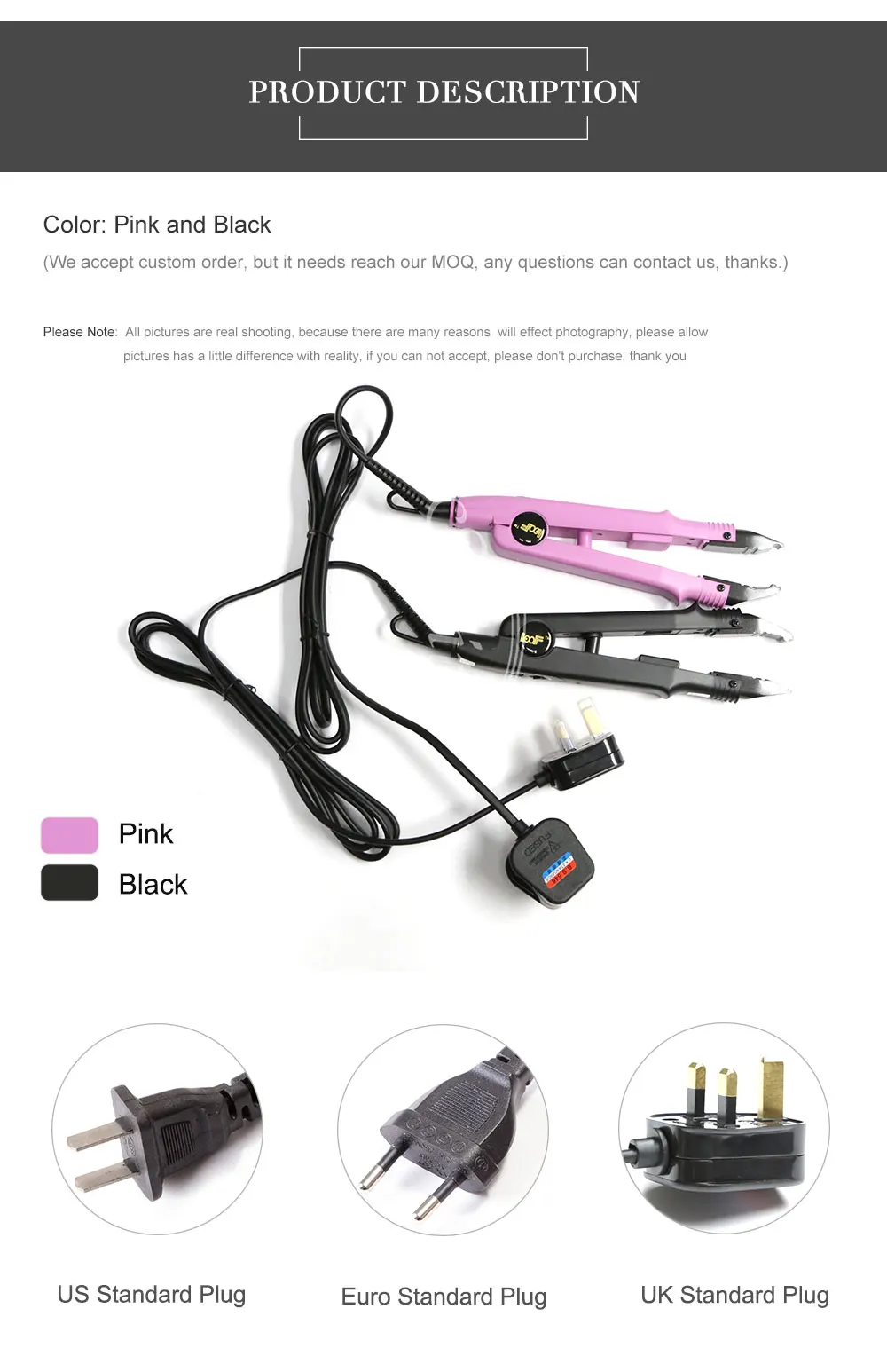 Обратите внимание: потому что сейчас приближается новый год, Логистика очень медленная, это займет около 30-60 рабочих дней, поэтому долгое время, чтобы приехать через CPAM, поэтому, если вы хотите быстро получить товар, пожалуйста, выберите DHL/Fedex, чтобы он прибыл в течение 3-5 рабочих дней, спасибо! Совершенно новый Утюг для наращивания волос/коннектор Цвет: черный, розовый 2 цвета Стиль: евро, США, Великобритания 3 стандартный штекер Контроль температуры от 100 °C до 210 °C Подходит для всех типов систем наращивания волос Вес: около 310 г за штуку У нас есть черный, розовый два цвета, этот вид утюга для наращивания волос в наличии, пожалуйста, сообщите нам цвет, который вы хотите, когда вы размещаете заказ, спасибо!
