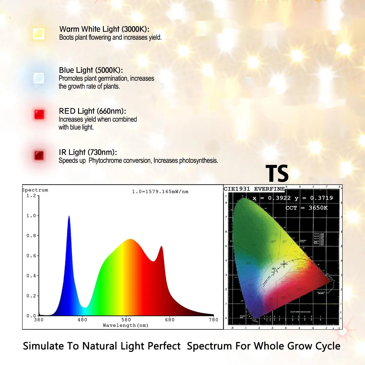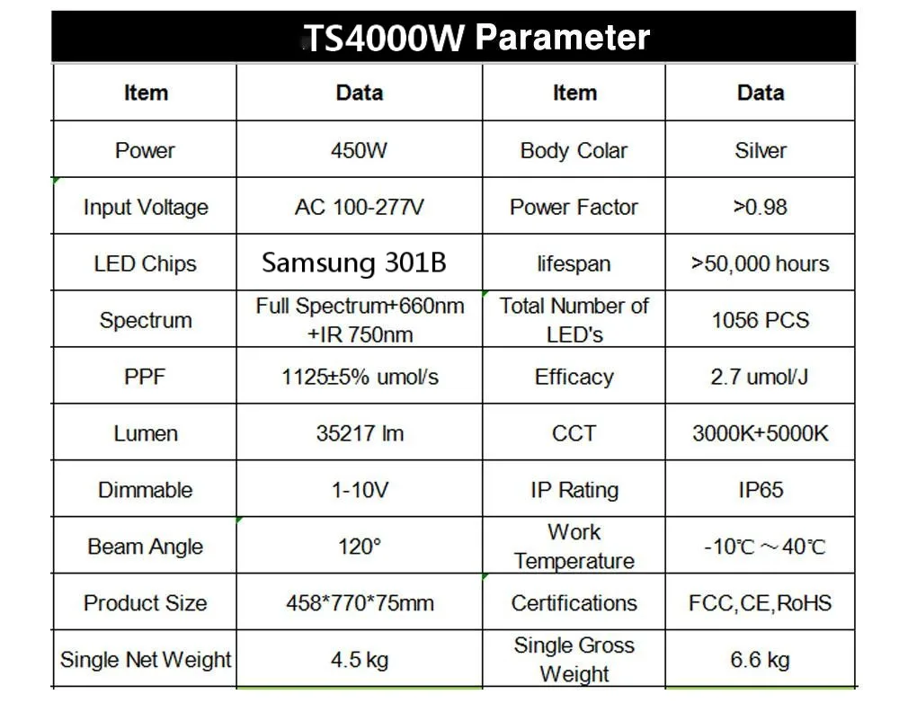 Значение PPFD Тс может обеспечить ваших растений с Высокая PPFD значение, до 2,7 μmol. В то время как его средняя цена за единицу плотности очень дешевая. Люминесценция Люминесценция TS аналогична HID's, для удовлетворения потребностей производителей с HID огнями идеально. Между тем TS имеет высокую светоотдачу, до 190 люмен/Вт Рассеивание тепла Высококачественные радиаторы могут эффективно нагревать лампу, ее тепло очень низкое при использовании. Поэтому лампе не нужен вентилятор. Весит светильник Светильник TS очень легко повесить и использовать из-за его простой структуры и веса светильник. Замена HPS Эффективно заменяет 1000 Вт HID при потреблении 100 Вт фактической мощности. Нет шума, подходящая температура Так как вентилятора нет, вам не придется выдержать шум, когда вы включите этот светильник, как вы сделали с другими. И эта TS имеет ту же температуру, что и HID лампа. Уход за клиентами Местный ремонтный центр в Польше. Мы можем предложить отечественную гарантию для производителей по всему миру.