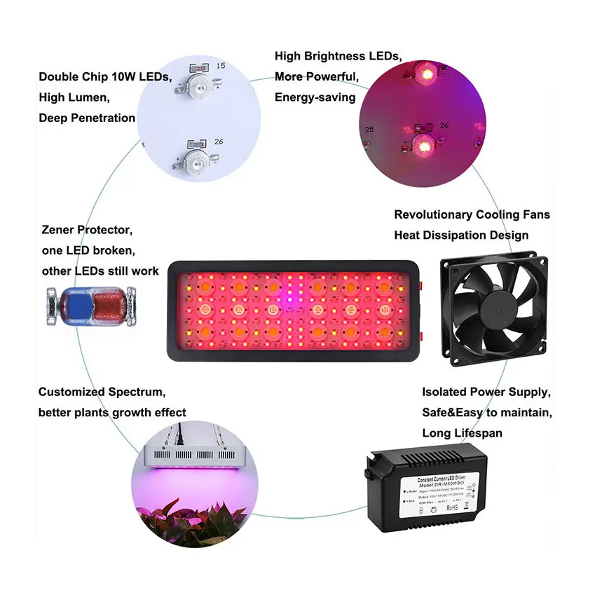 По сравнению с HPS/MH-светодиодный светильник для выращивания 600 Вт/900 Вт может заменить традиционный 400 Вт/600 Вт HPS/MH при потреблении всего 100 Вт/220 Вт! Более эффективная зона покрытия, чем любой отражатель серии огней. Идеально подходит для роста 3x3 футов на 24 дюйма. Разница в том, что мы используем двойные вентиляторы охлаждения. Может продлить срок службы светильник.