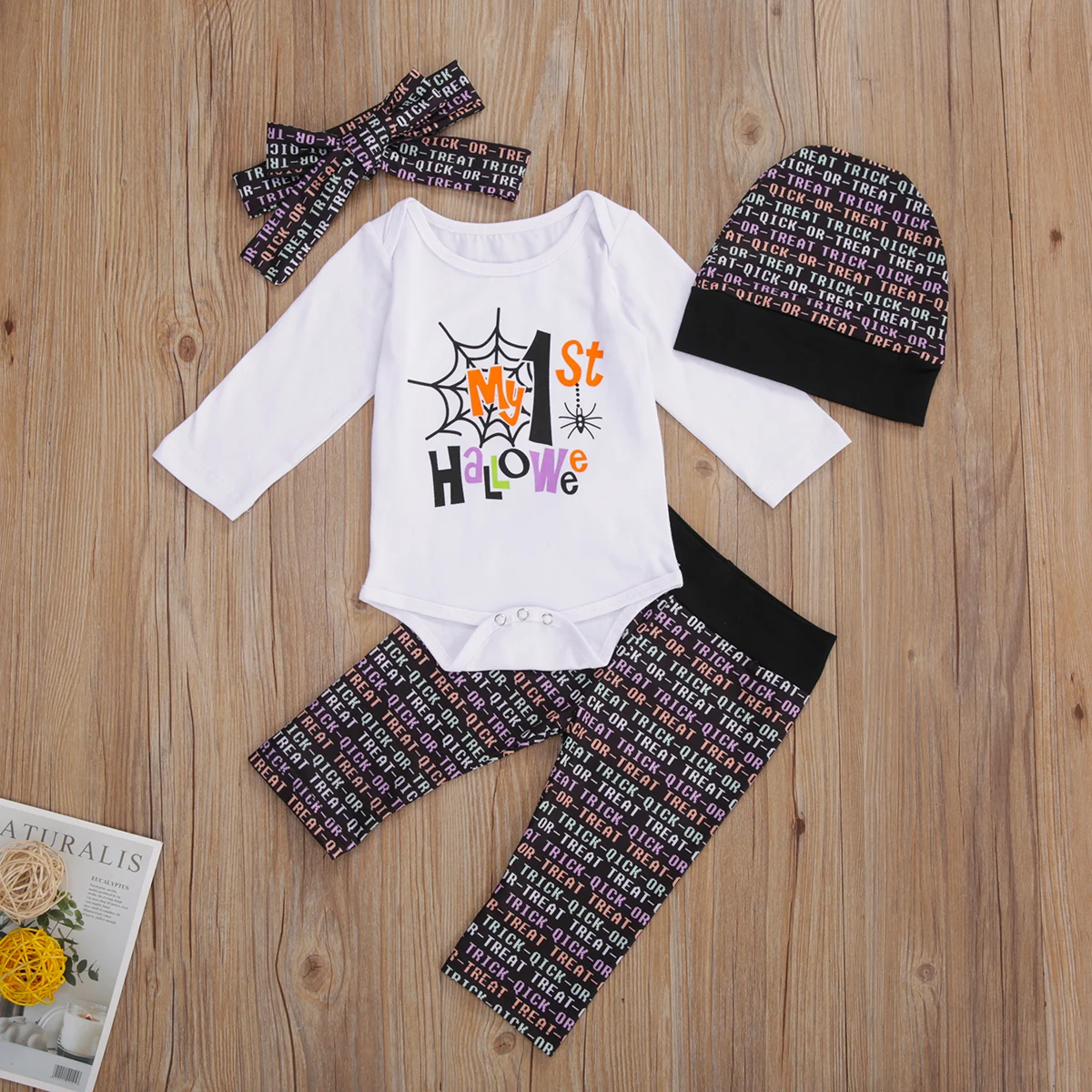 Комбинезон для Хэллоуина для маленьких мальчиков и девочек, брюки с принтом и головной повязкой, комплект из четырех предметов, идеальный костюм, который сделает вашу девочку повседневной свежей и комфортной, полной энергии и жизненной силы. Повседневный комбинезон с длинными рукавами и длинные штаны идеально подходят для дня рождения ребенка.