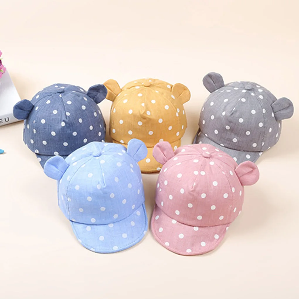 The kid's sun hat is adorable and designed with dots on the surface and decorated with ears.