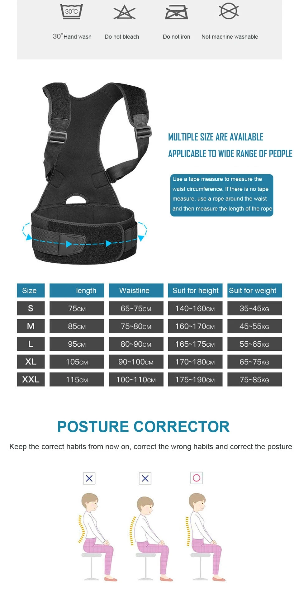Технические характеристики изделия: Материал: ок ткань, нейлон, SBR; Цвет для заказа цвета: черный; Подходит для детей, женщин, мужчин; Размер: S/M/L/XL/XXL; S: обхват талии 65-75 см (подходит для веса 35-45 кг); M: обхват талии 75-80 см (подходит для веса 45-55 кг); L: обхват талии 80-90 см (подходит для веса 55-65 кг); XL: обхват талии 90-100 см (подходит для веса 65-75 кг); XXL: обхват талии 100-110 см (подходит для веса 75-85 кг); Особенности: Поддерживающий дизайн помогает исправить плохую осанку тела спины и плеч; Тянет плечо и спину для коррекции осанки; Обеспечивает мягкую поддержку спины; Профилактика обычного горбатого подростка, не ограничивающая односекционный дизайн для мужчин и женщин; Полностью регулируется, удобно и легко носить; Посылка включает в себя: 1 шт. Корректор Осанки Спины