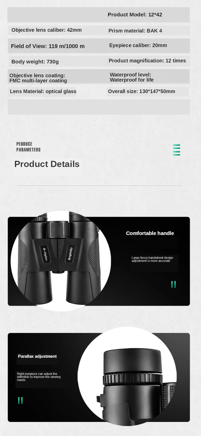 Описание товара: Модель изделия: 12x42 бинокль Объектив калибра: 42 мм Материал призмы: BAK4 Поле зрения: 129 м/1000 м Калибр окуляра: 20 мм Вес зеркала: 730 г Коэффициент удваивания продукта: 12 раз Объектив покрытия: FMC многослойное покрытие Уровень водонепроницаемости: водонепроницаемый Материал линз: оптическое стекло Размер формы: 130 × 147*50 мм