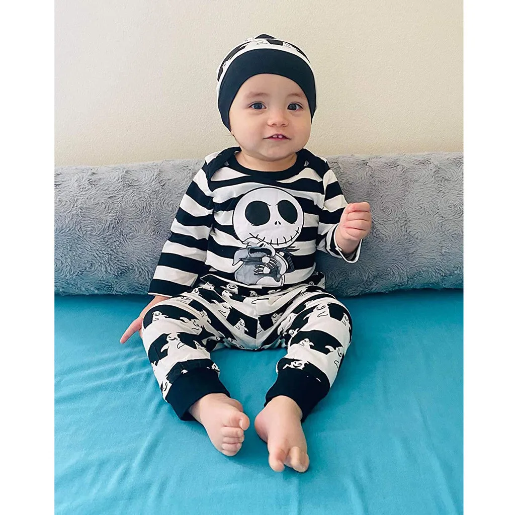 Newborn Infant Baby Boys Cartoon Romper Pants Hat Halloween Skull Outfits Set