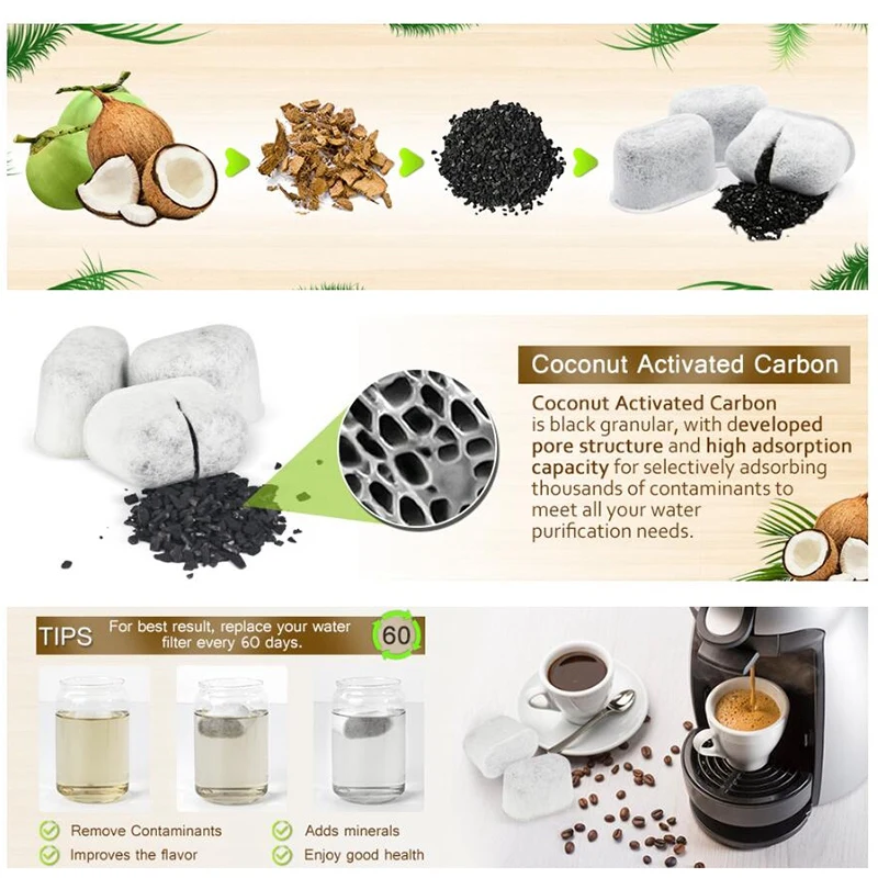 Features: Coffee machine filter activated carbon package can remove impurities, calcium, chlorine and odor, can harm health, reduce lime and increase the life of your coffee maker.
