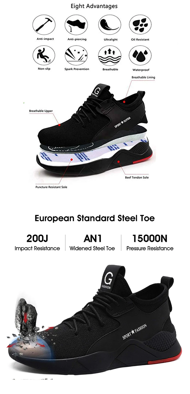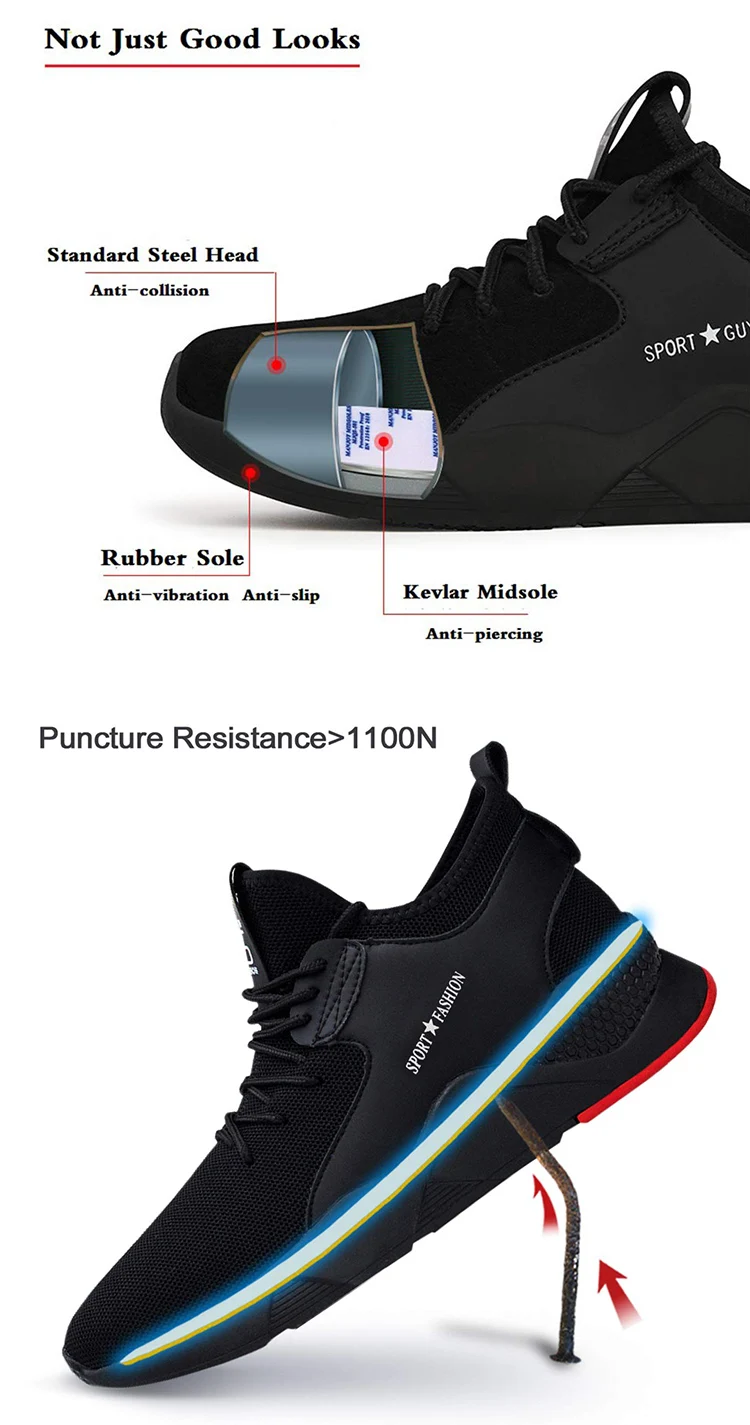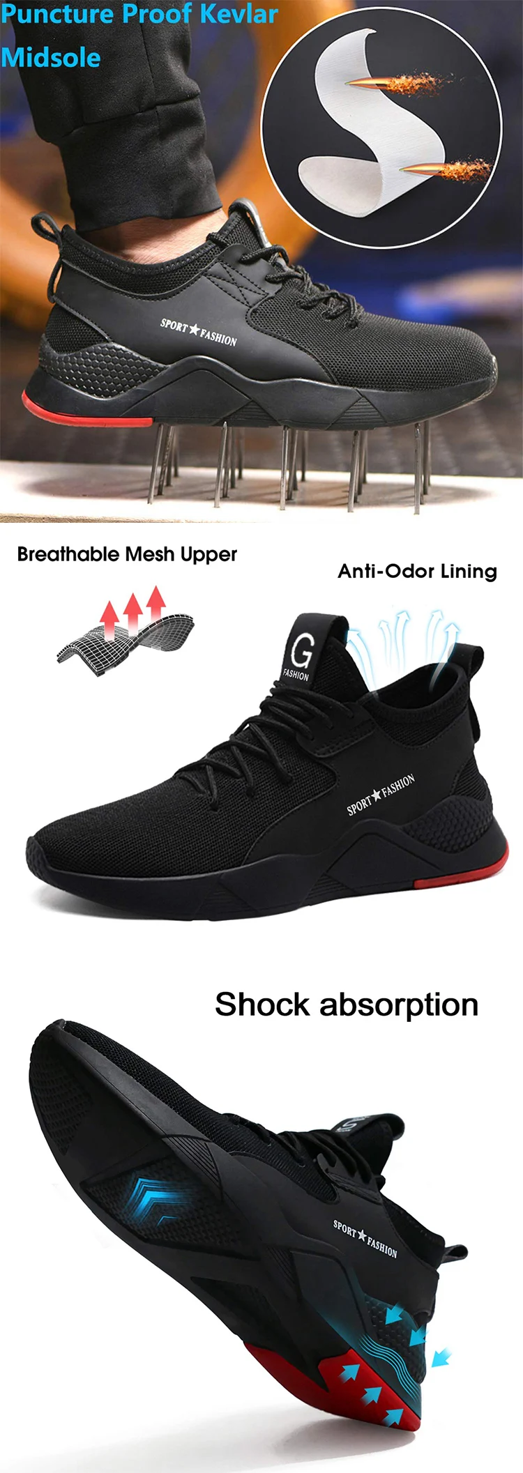 Резиновая подошва ✿For four seasons wear.Slip Resistant: Изготовлен из резиновой подошвы и материала, который помогает обеспечить скольжение и сцепление на различных поверхностях. ✿Многократное Использование: идеально подходит для промышленных и строительных площадок, эксплуатации, ковки цеха, производства и использования в складах. В жесткой рабочей среде, Наша рабочая обувь гарантированно будет удобной, прочной и безопасной, она также может работать как повседневные кроссовки для ежедневного использования. ✿Дышащий сетчатый верх: дышащий и прочный сетчатый верх обеспечивает превосходную воздухопроницаемость и быстрое высыхание. ✿Защитная стальная крышка носка: Анатомически правильные кроссовки с стальным носком для комнатной коробки для пальцев и отличной арки, которая поддерживает естественные контуры стопы. ✿Устойчивая к проколу кевларовая подошва: Рабочая обувь с легкой кевларовой подошвой создана для защиты ваших ног от проколов острыми предметами, такими как гвозди, стальная планка.