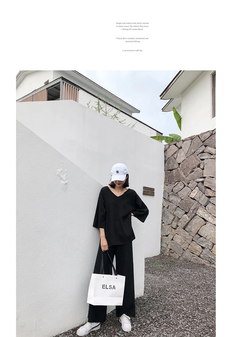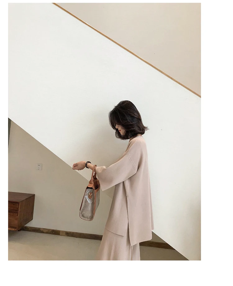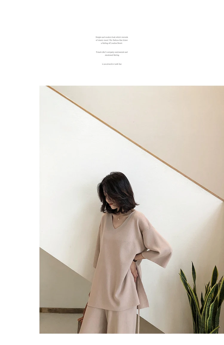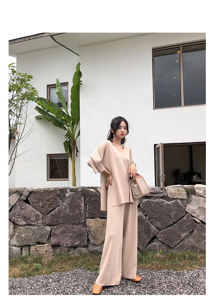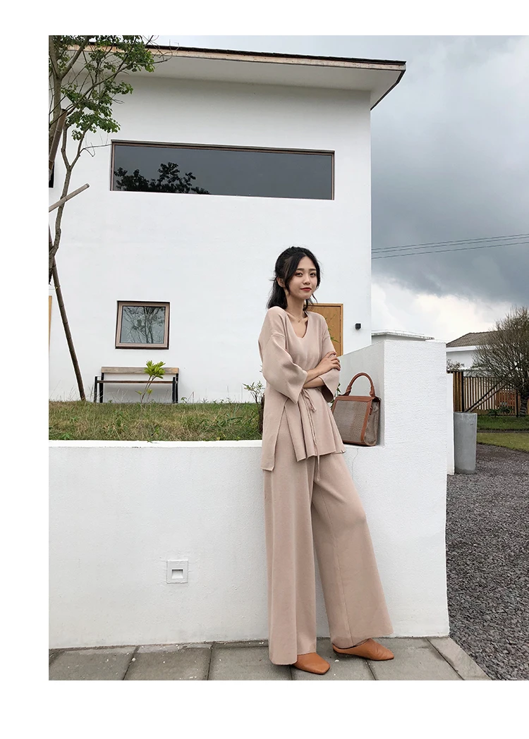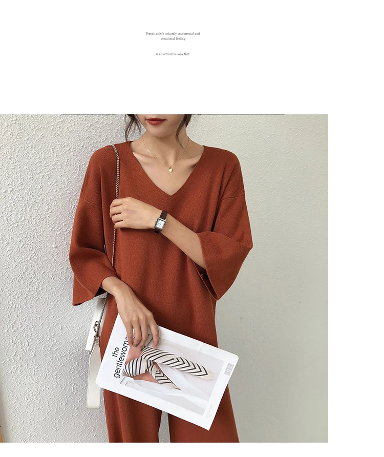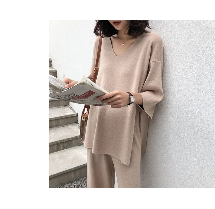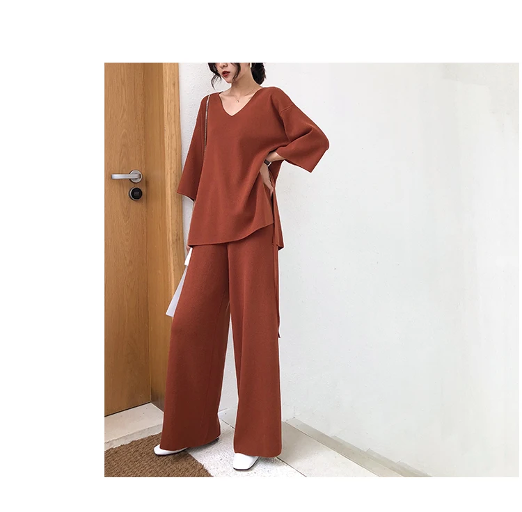 Трикотажный женский костюм из Свитера и брюк, комплект из двух предметов, трикотажный пуловер с V-образным вырезом, Топ с длинным рукавом и широкие брюки, DG633